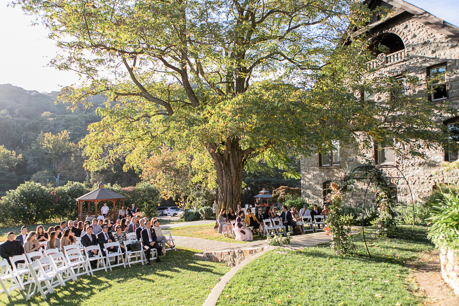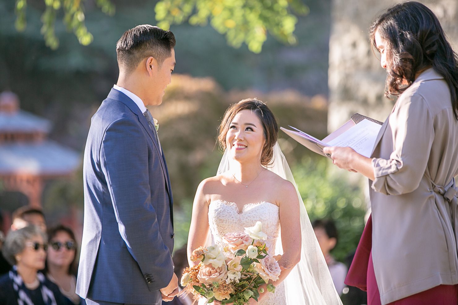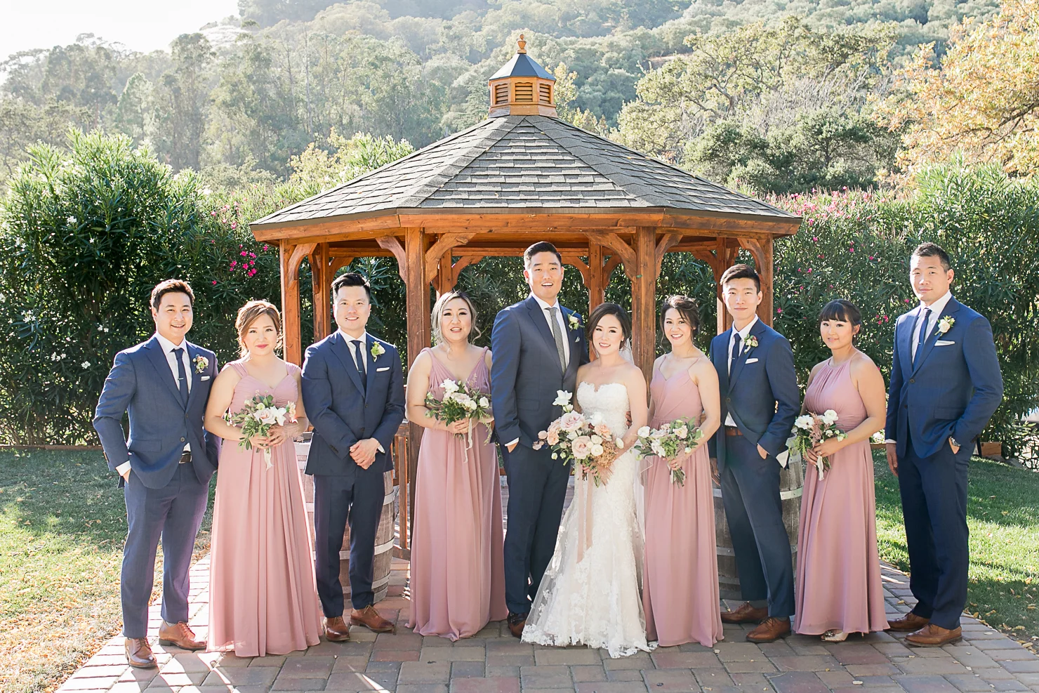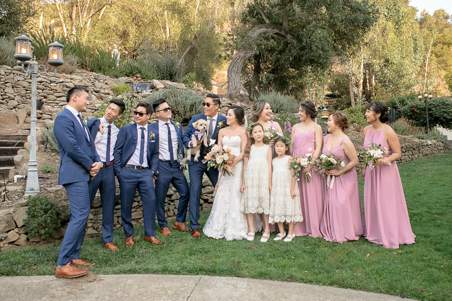We started the day at the Fairmont Hotel in San Jose with the girls getting ready. I loved Grace’s choice of bridal look, her make up was very natural with an elegant side bun. Her gorgeous dress from Cacablanca which looked amazing on her, and the long veil completed her stunning bridal look. The wedding was in November but we were lucky to have a warm day. Elliston is very picturesque from the stone mansion, vineyards to the gardens are the perfect backdrop for Grace and Tim’s wedding.
