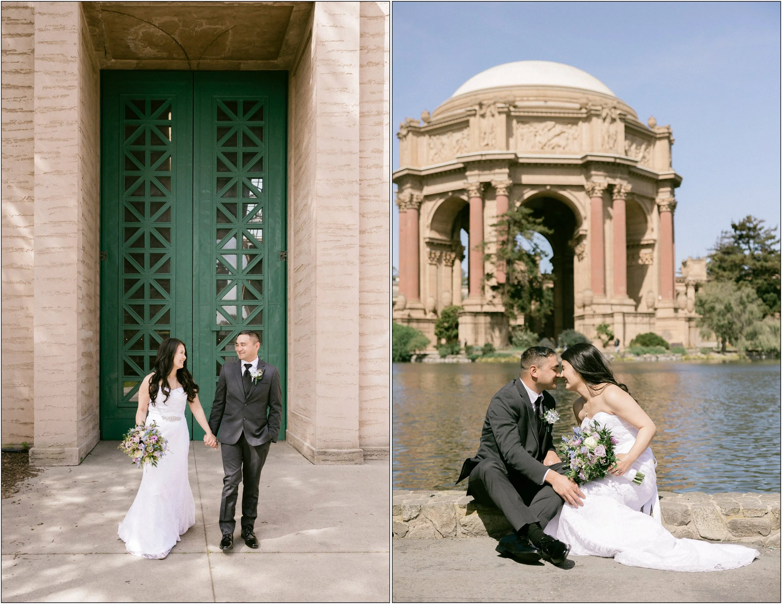 It was great to finally meet Shelley and Wilson to photograph their beautiful San Francisco city hall fourth-floor wedding. We started the session at the palace of fine arts with some portraits. It was a great choice for Shelley and Wilson to stroll the palace and have some alone time before the ceremony. It wasnβt the usual golden hours Iβm used to photographing but we made it work and it turned out beautiful!